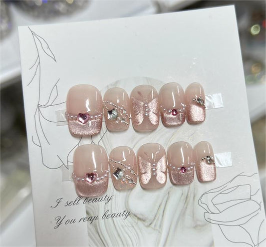 Short Coffin Light Champagne Cat Eye Hand-Painted Butterfly with Small Diamonds Handmade Press-On Nails | Removable and Reusable | Free Tool Kit Included