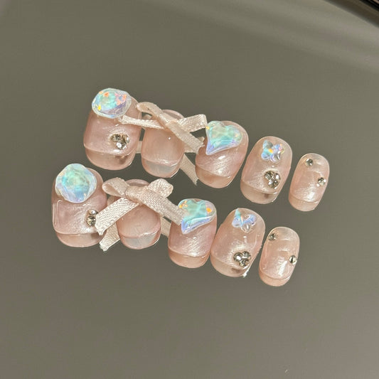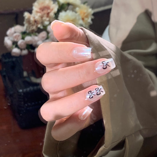 Nude Blush Ombre Short Square Handcrafted Press-On Nails | Adorned with Cute Bow Ties|Free Tool Kit Set Included