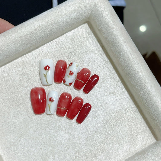 Ultra-Short Square Red Enamel Cloisonné Art Press-On Nails – Handmade Press-On Nails | Removable and Reusable | Free Tool Kit IncludedRegular price $33.00 USDRegular priceUnit price / per-