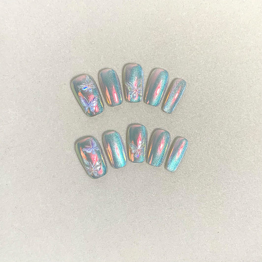 Medium Coffin Silver Moonlight & Hand-Painted Butterfly Handmade Press-On Nails | Removable & Reusable | Free Tool Kit Included