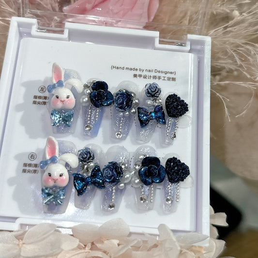 Cute Lolita Press On Nails|Baby Blue Sweetheart-shaped Bunny Face Nails|Black Rose and Bows|Free Tool Kit Set Included