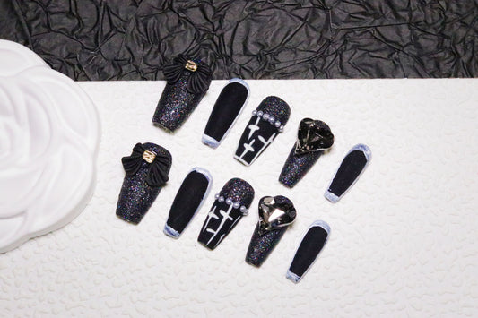 Black Heart Diamond Bow Press On Nails| Perfect for the Elegant and Sophisticated Woman&Girl|Free Tool Kit Set Included