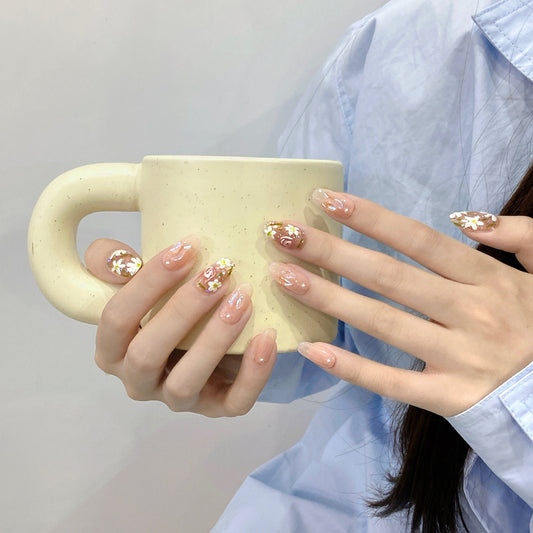 Short Oval Nude Nail Polish with Hand-Painted Colorful Flowers Handmade Press-On Nails | Detachable and Reusable | Free Toolkit Included