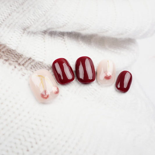 Ultra Short Round Cherry Red & Hand-Painted Cherry Design Handmade Press-On Nails | Removable & Reusable | Free Tool Kit Included