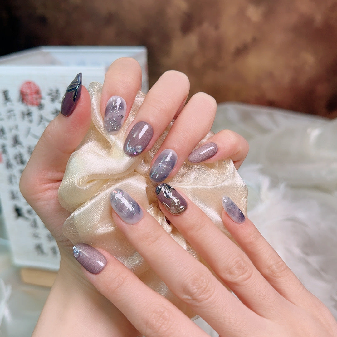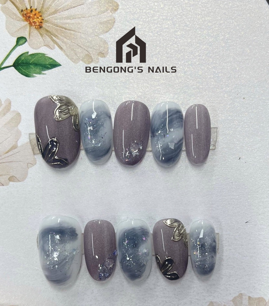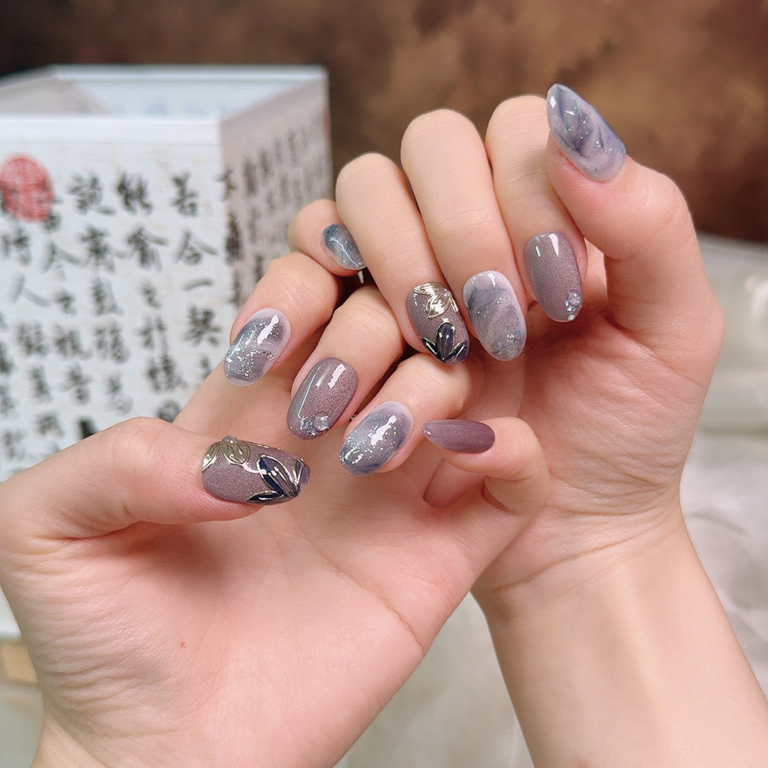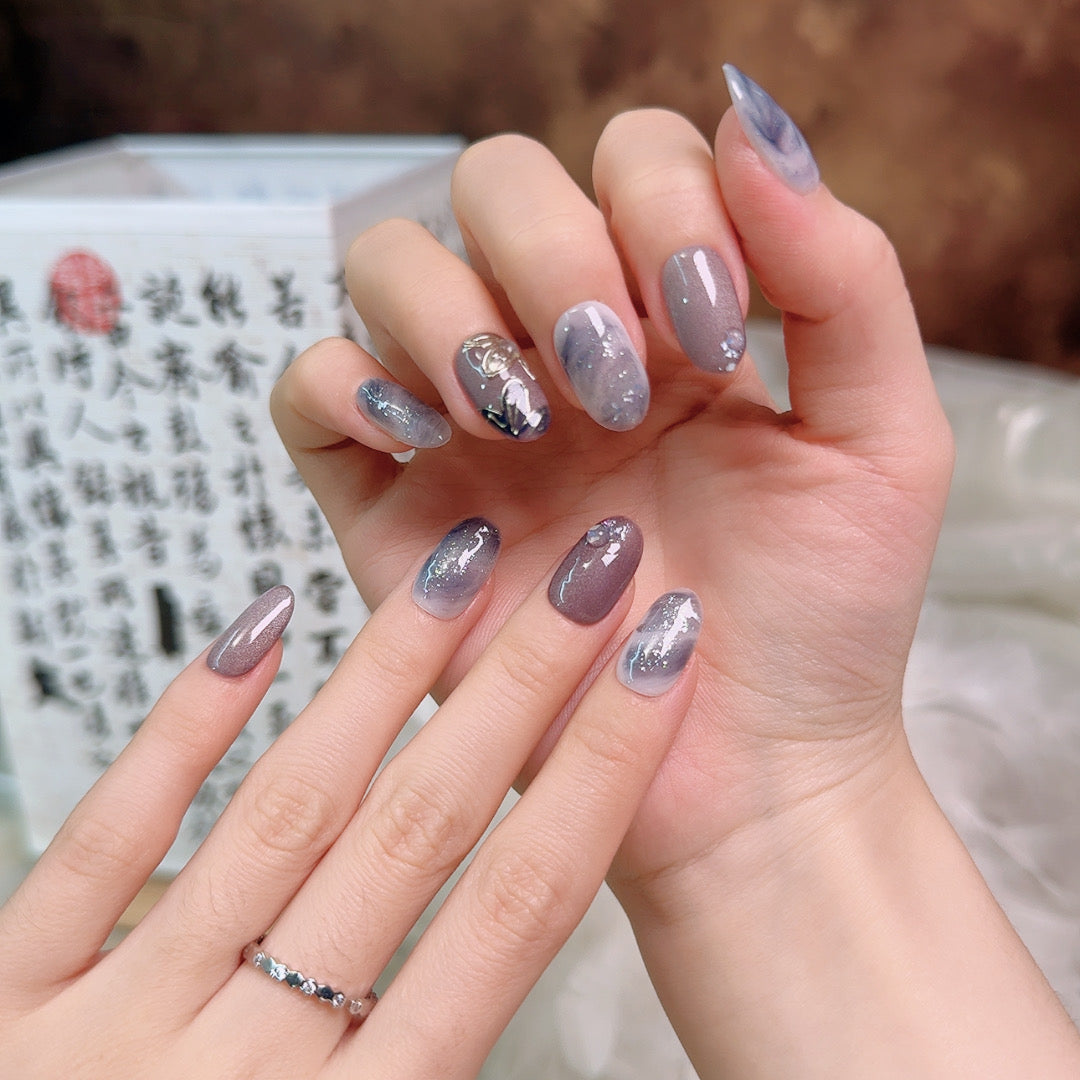 Ash Petal Art Handmade Press-On Nails | Medium Oval | Removable and Reusable | Free Tool Kit Included