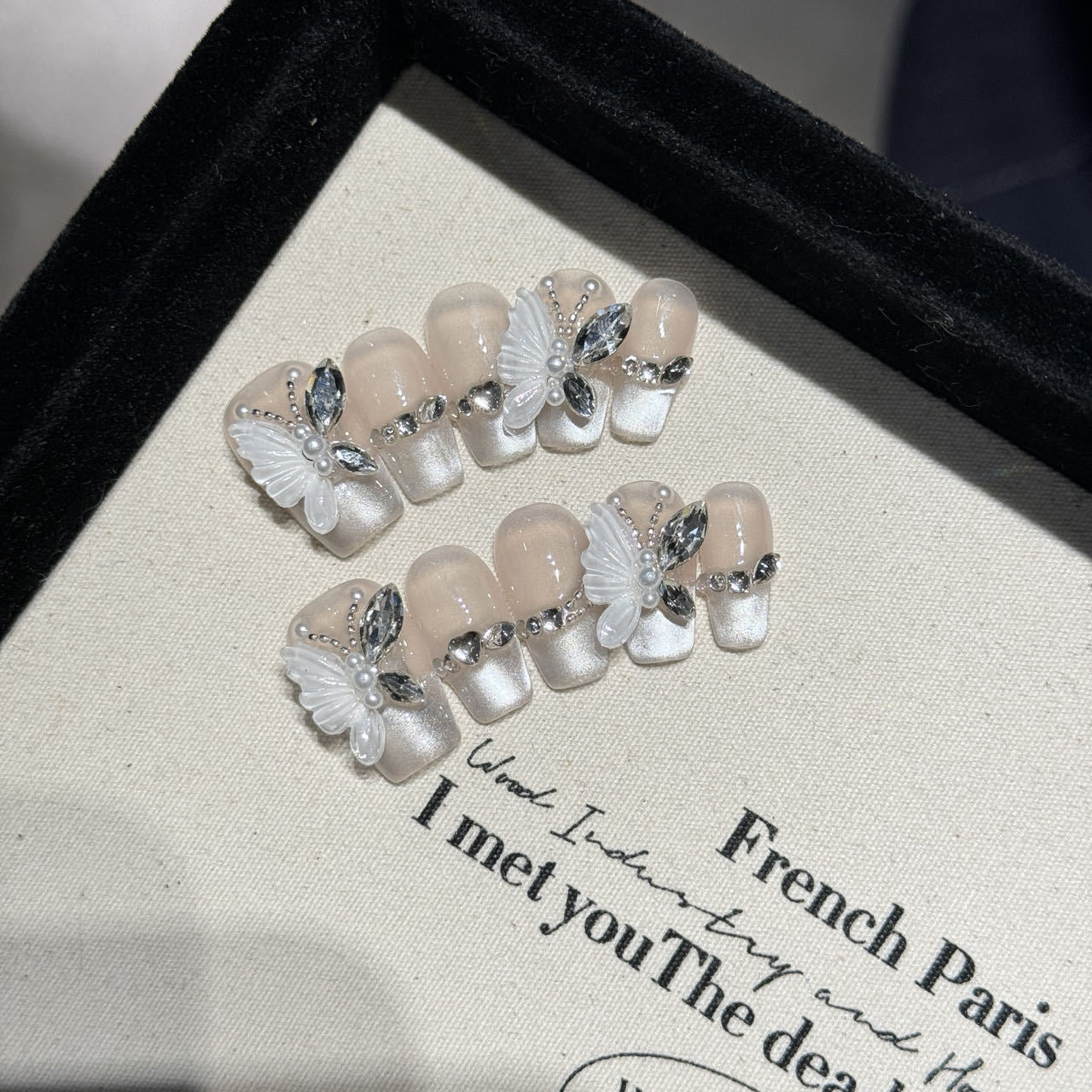 Medium Coffin Glass Bead Cat Eye French Tip & 3D Butterfly Handmade Press-On Nails | Removable & Reusable | Free Tool Kit Included