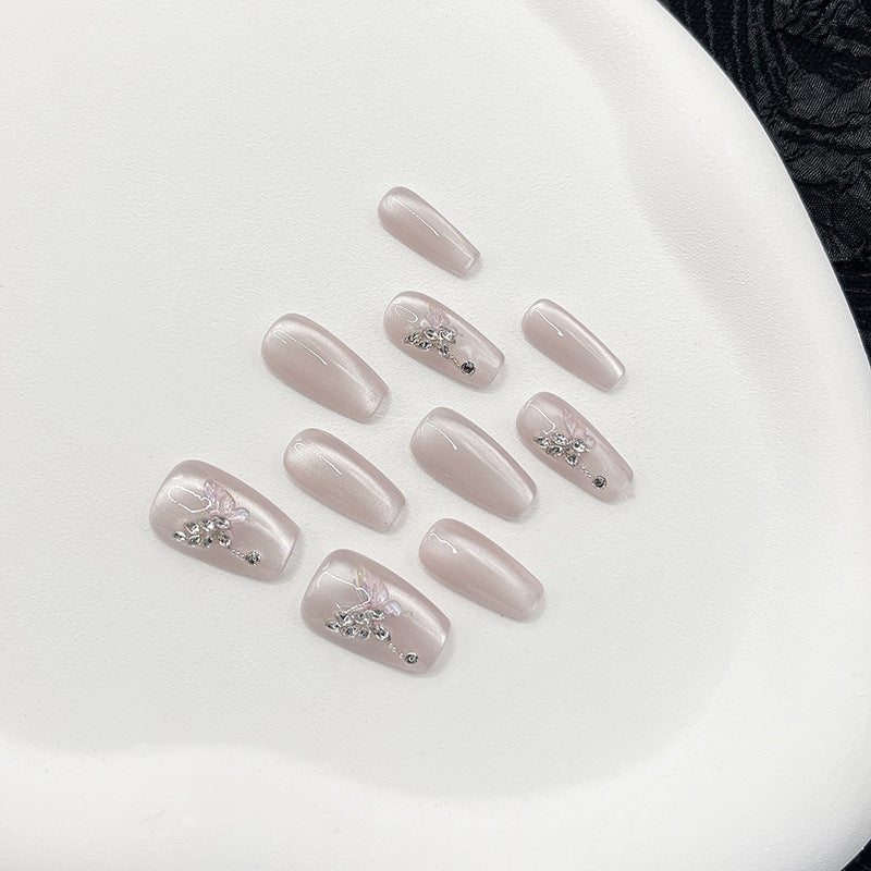Medium Coffin Pink-Gray Cat Eye & Hand-Painted Butterfly Handmade Press-On Nails | Removable and Reusable | Free Tool Kit Included