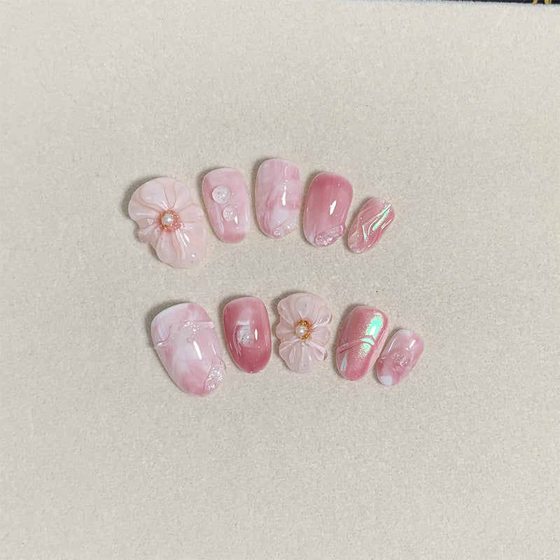 Short Oval Pink Micro-Carved Flower Handmade Press-On Nails | Removable and Reusable | Free Tool Kit Included