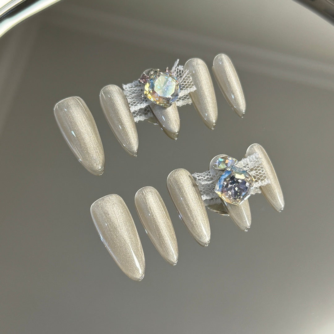 Stunning Bow Tie Ribbon Almond Press On Nails | Handcrafted, Detachable, Reusable|Free Tool Kit Set Included
