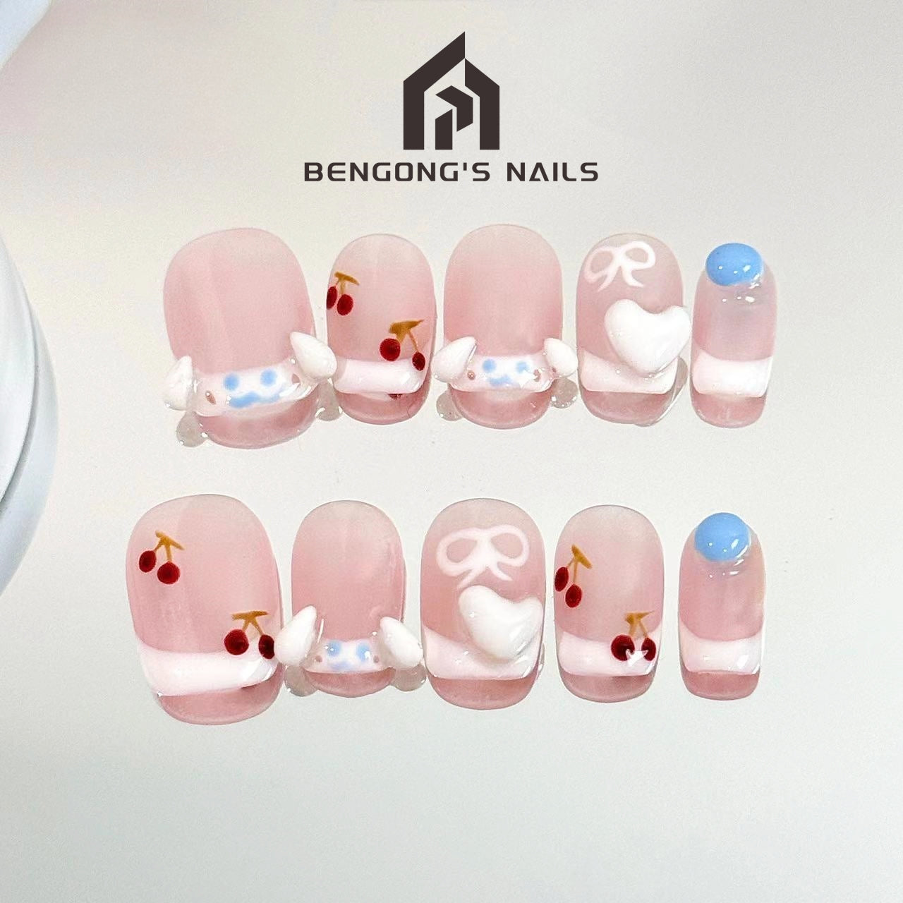 Ultra-Short Coffin Cute Puppy French Tip Cherry Handmade Press-On Nails | Removable and Reusable | Free Tool Kit Included