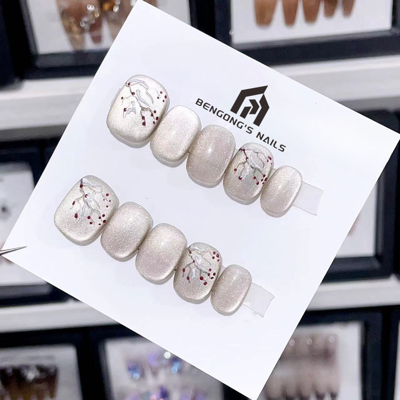 Ultra-Short Oval Chinese Style Hand-Painted Plum Blossom Gray Cat Eye Handmade Press-On Nails | Removable and Reusable | Free Tool Kit Included