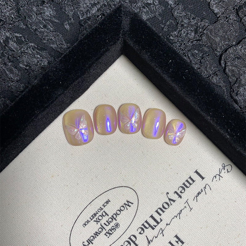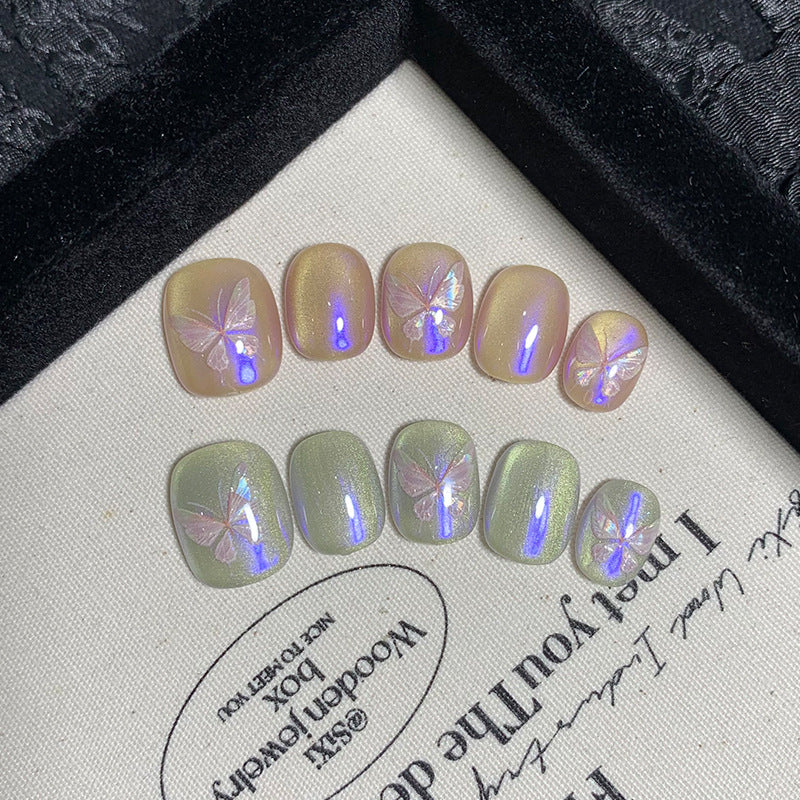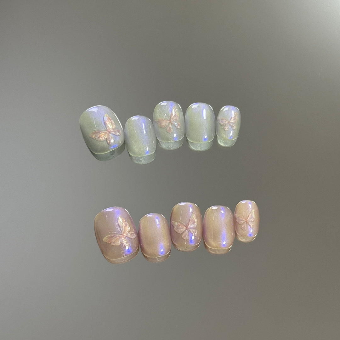 Ultra-Short Round AB Style Light Green and Light Pink Cat Eye & Hand-Painted Butterfly Handmade Press-On Nails | Removable and Reusable | Free Tool Kit Included