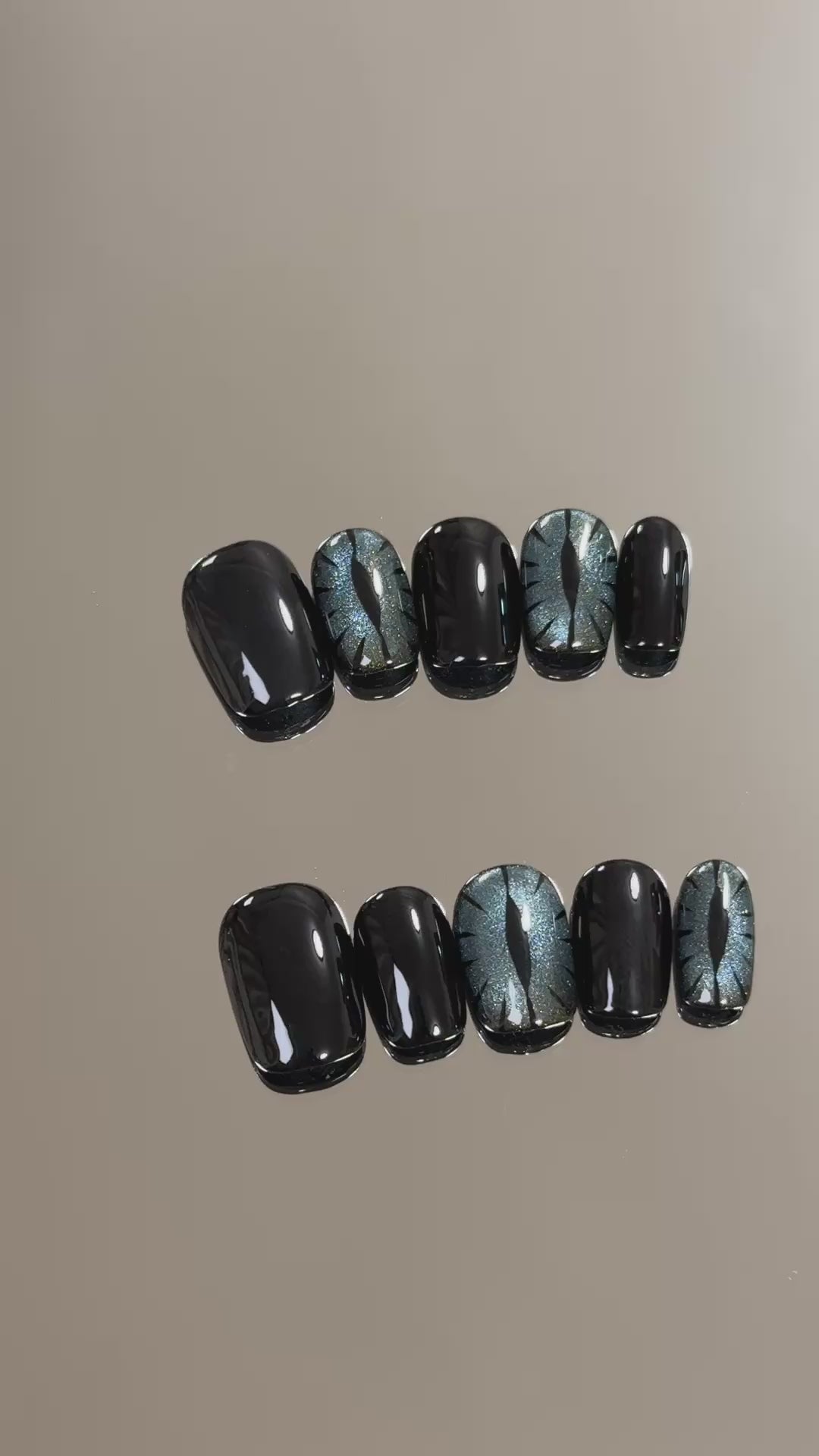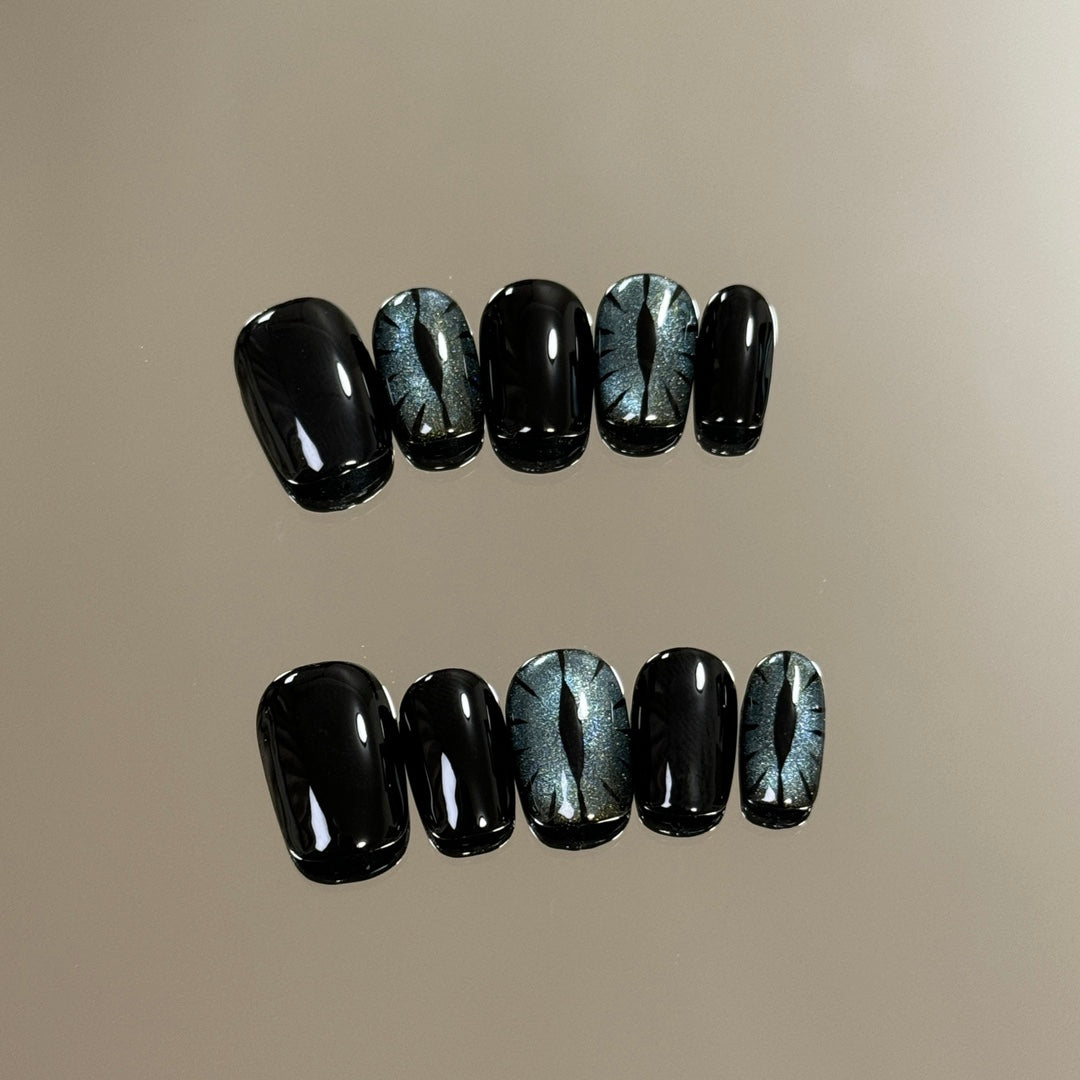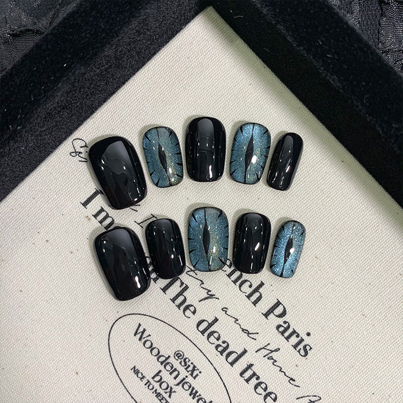 Ultra-Short Square Black Cat Eye and Blue Evil Eye Handmade Press-On Nails | Removable and Reusable | Free Tool Kit Included