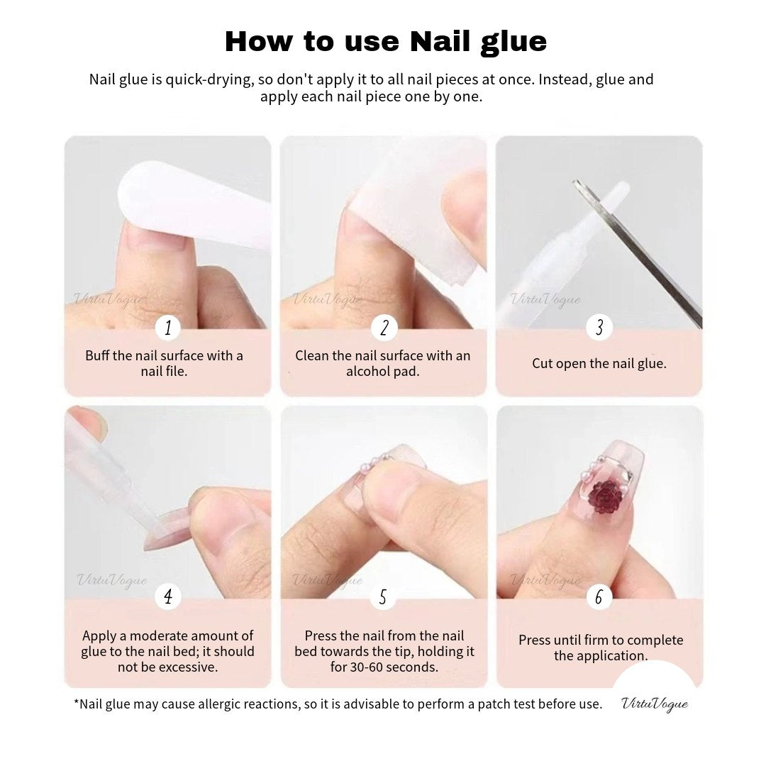 Select the appropriate nail piece for each finger. Each nail piece has a small number inside; the numbered end should be at the fingertip. Please do not wear it backwards.