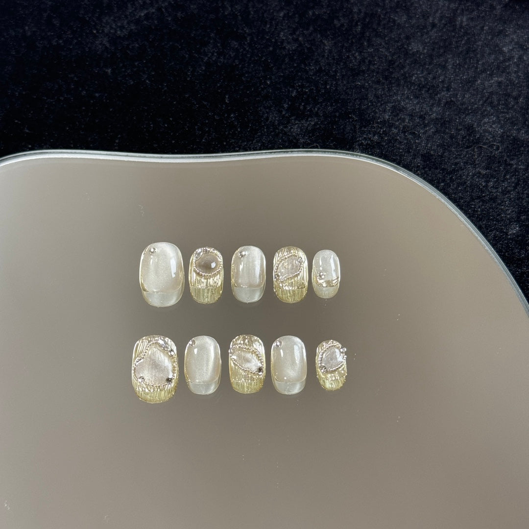 Ultra Short Square-Round Glass Bead Cat Eye & Bucciarati Handmade Press-On Nails | Removable & Reusable | Free Tool Kit Included